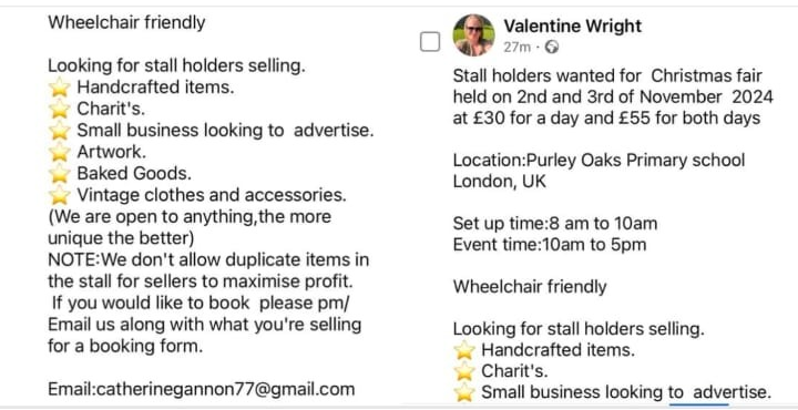 A post is circulating social media regarding a Christmas Fair being held at Purley Oaks Primary School on the 2nd November, asking vendors to pay to reserve a stall.
